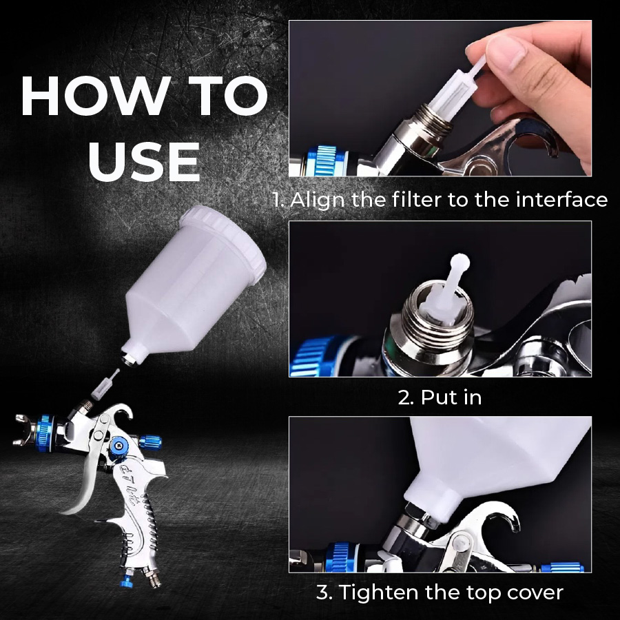 2️⃣ Strain & Fill: Always strain your paint to prevent clogs. Fill the 600ml cup with your chosen coating—primer, lacquer, or enamel—and make sure the brass air cap is secure.